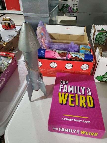 LOT 399 - Vintage 1957 Astro Mfg, Rocket Space Ship Mechanical Coin Bank, Berzac Corp, our family is so weird party game, princess activity book, Barbie doll, Slinky Jr and more.