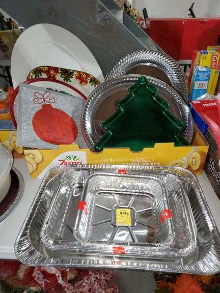 LOT 408 - Square and rectangular disposable foil trays, assorted seasonal and other serving trays