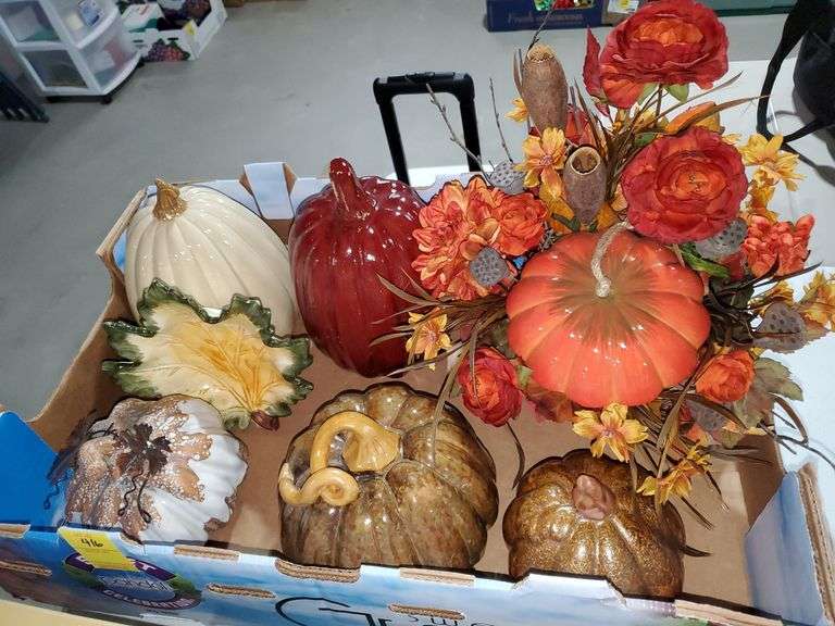 LOT 416 - Assorted ceramic pumpkins, leaf bowl, pumpkin artificial arrangements.