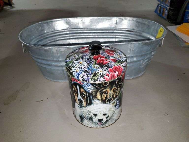 LOT 423 - 22-in oblong wide galvanized tub, puppy tin with lid.